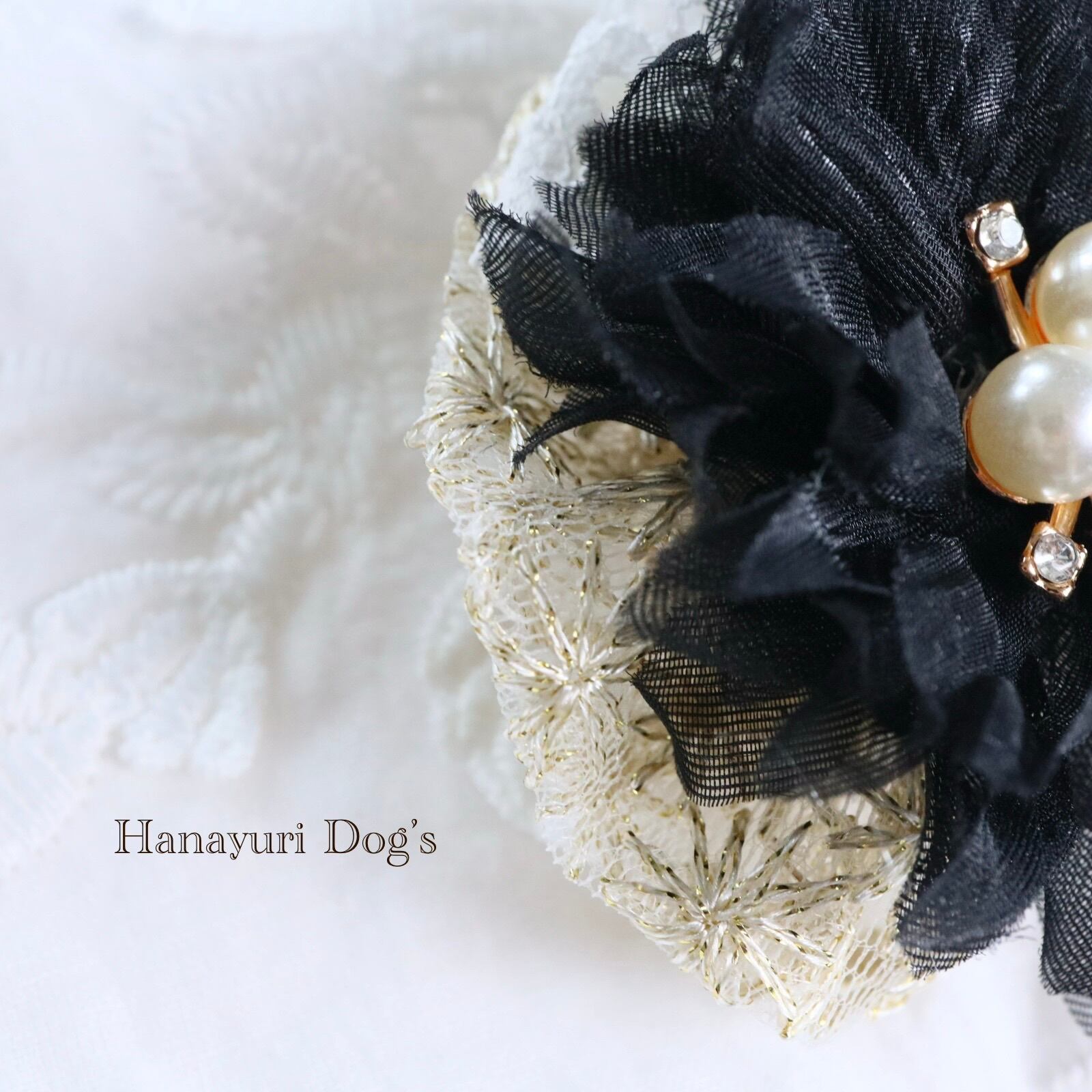 訳あり特価 チュールの花黒 カクテルハット風 ゴールドとホワイトレース パールビジュー 犬バレッタ キッズ・子供リボン ペット ぬいぐるみ ヘアアクセサリー 髪飾り 誕生日 記念日 プレゼント オフ会 うちの子記念日 イベント 撮影