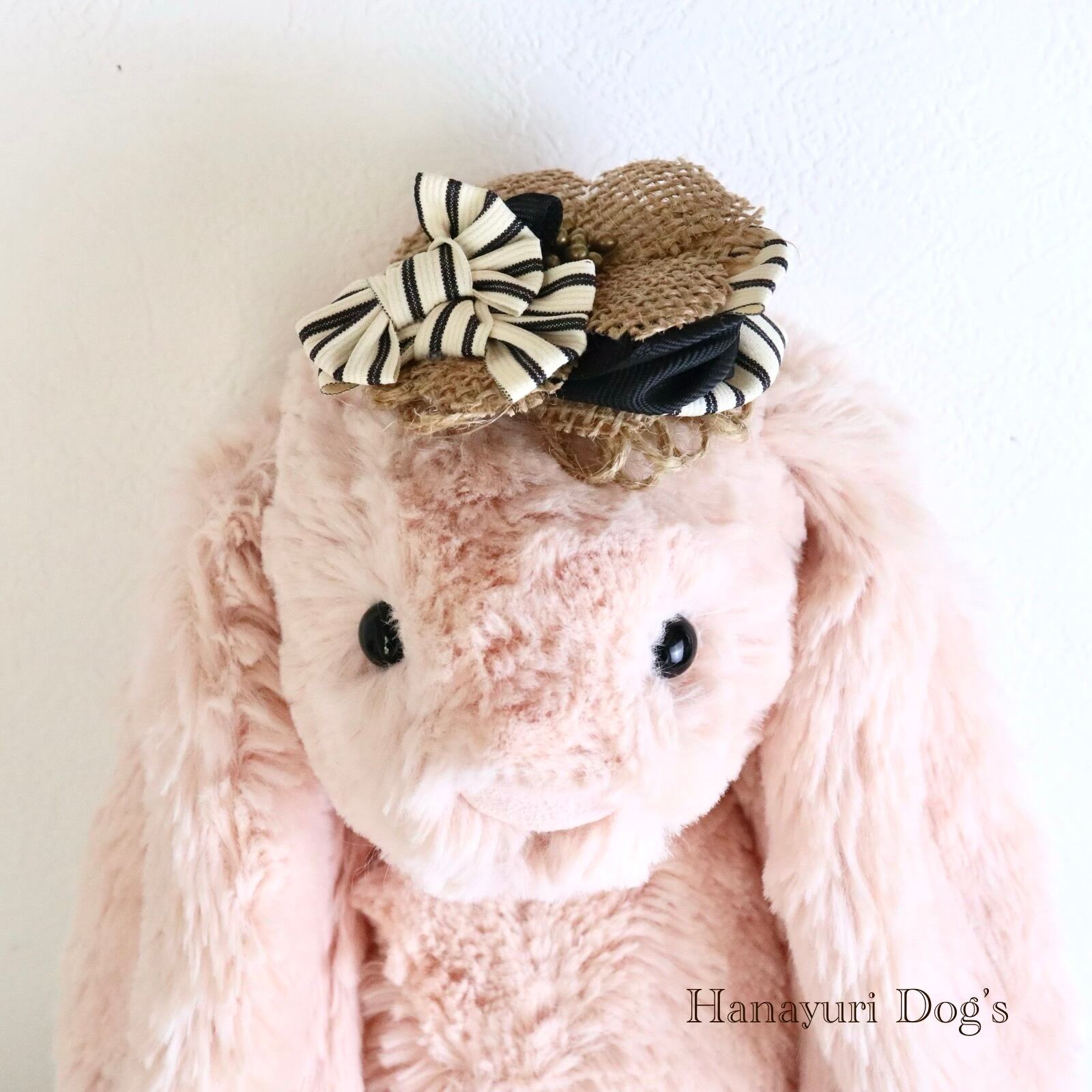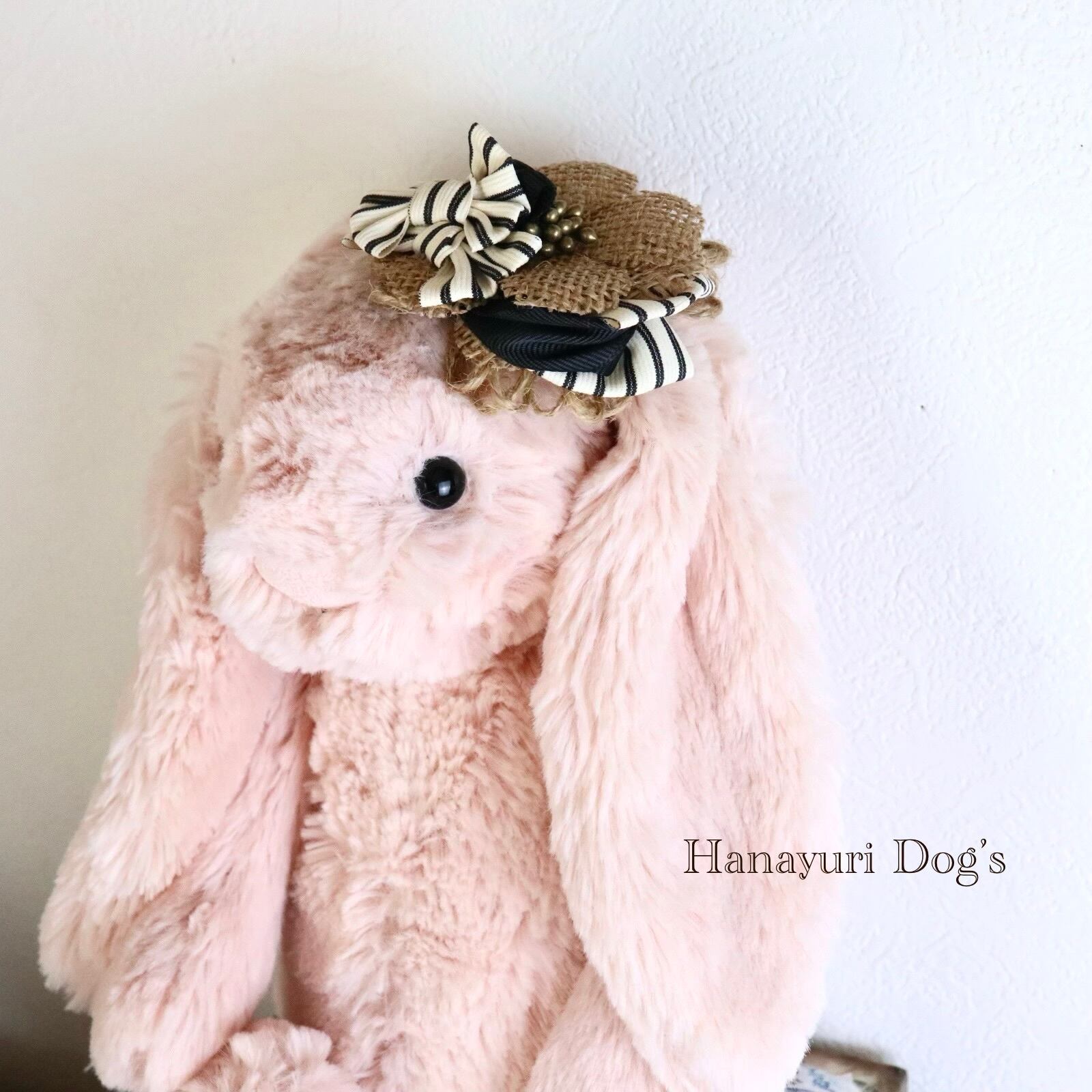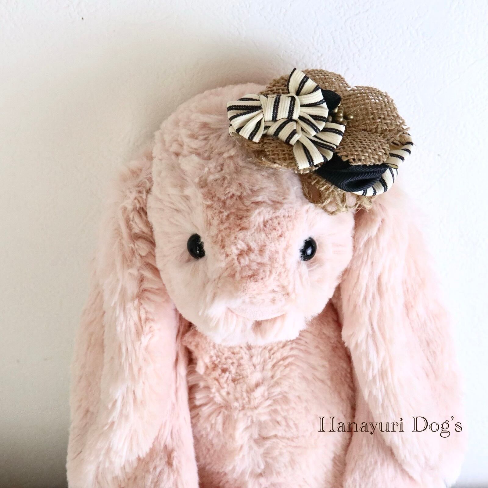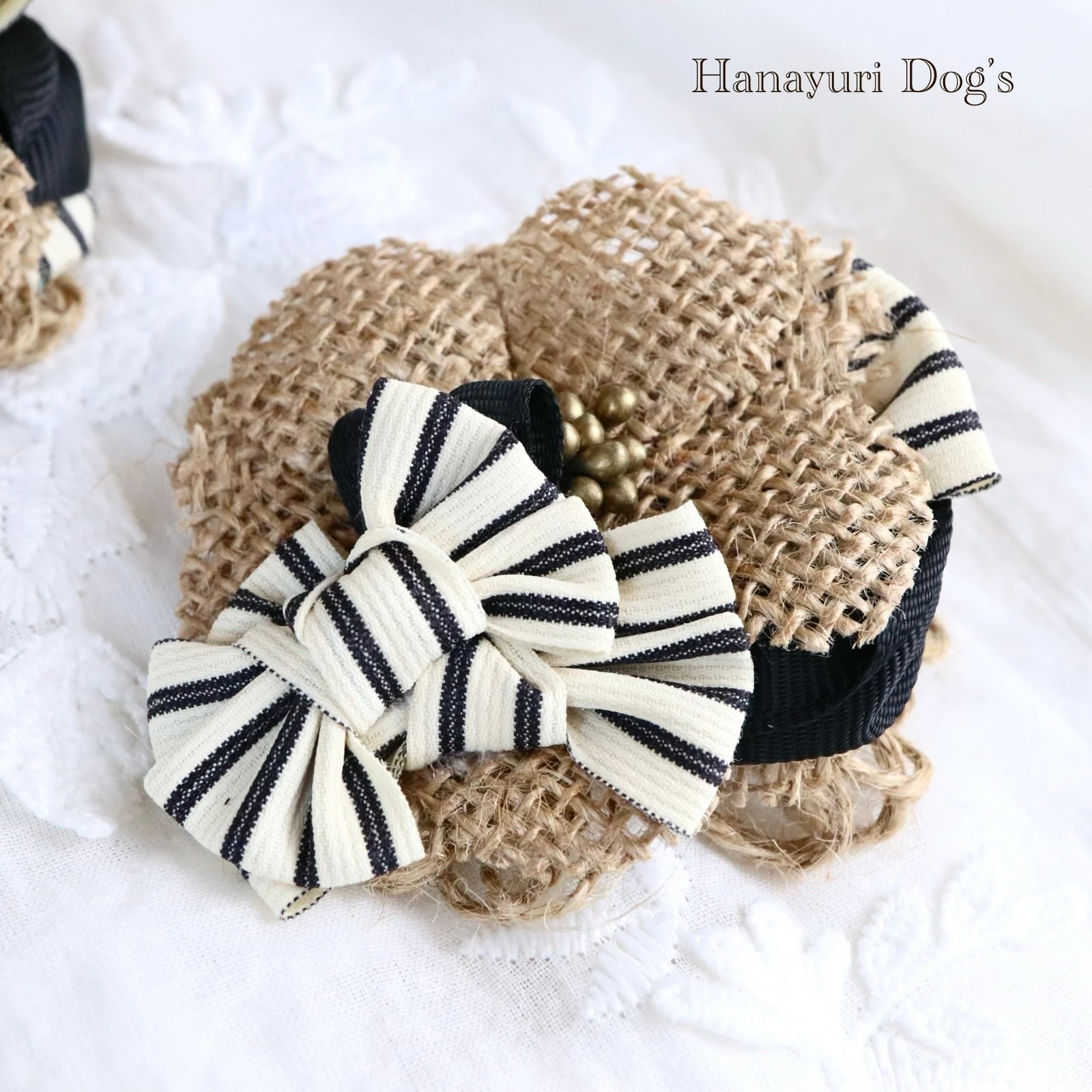 帽子風バレッタリボン ストライプ 黒 麻 犬バレッタ キッズ・子供リボン ペット ぬいぐるみ ヘアアクセサリー 髪飾り 誕生日 記念日 プレゼント オフ会 うちの子記念日 イベント 撮影