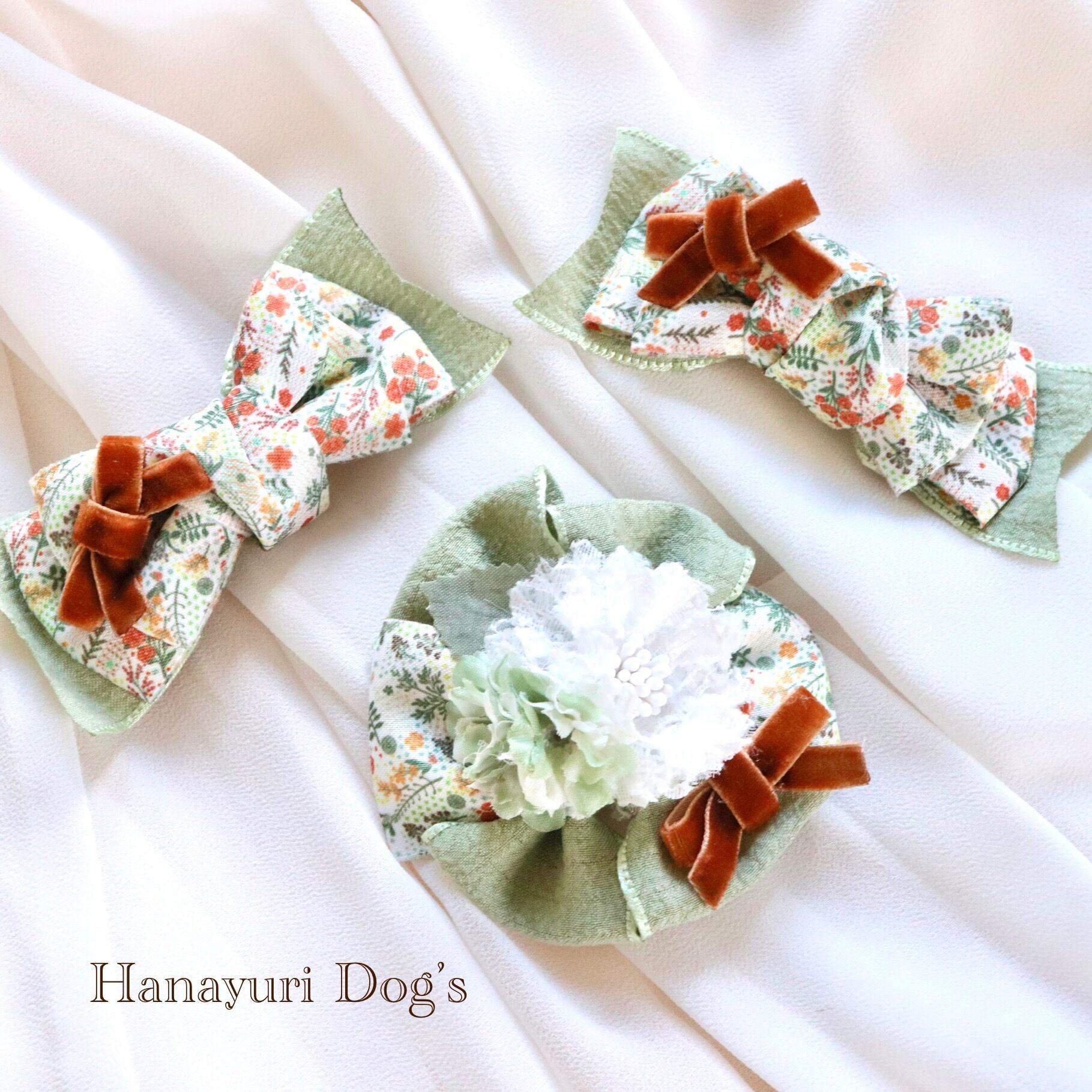 フレンチレトロなグリーンと植物柄のリボンの組み合わせ。