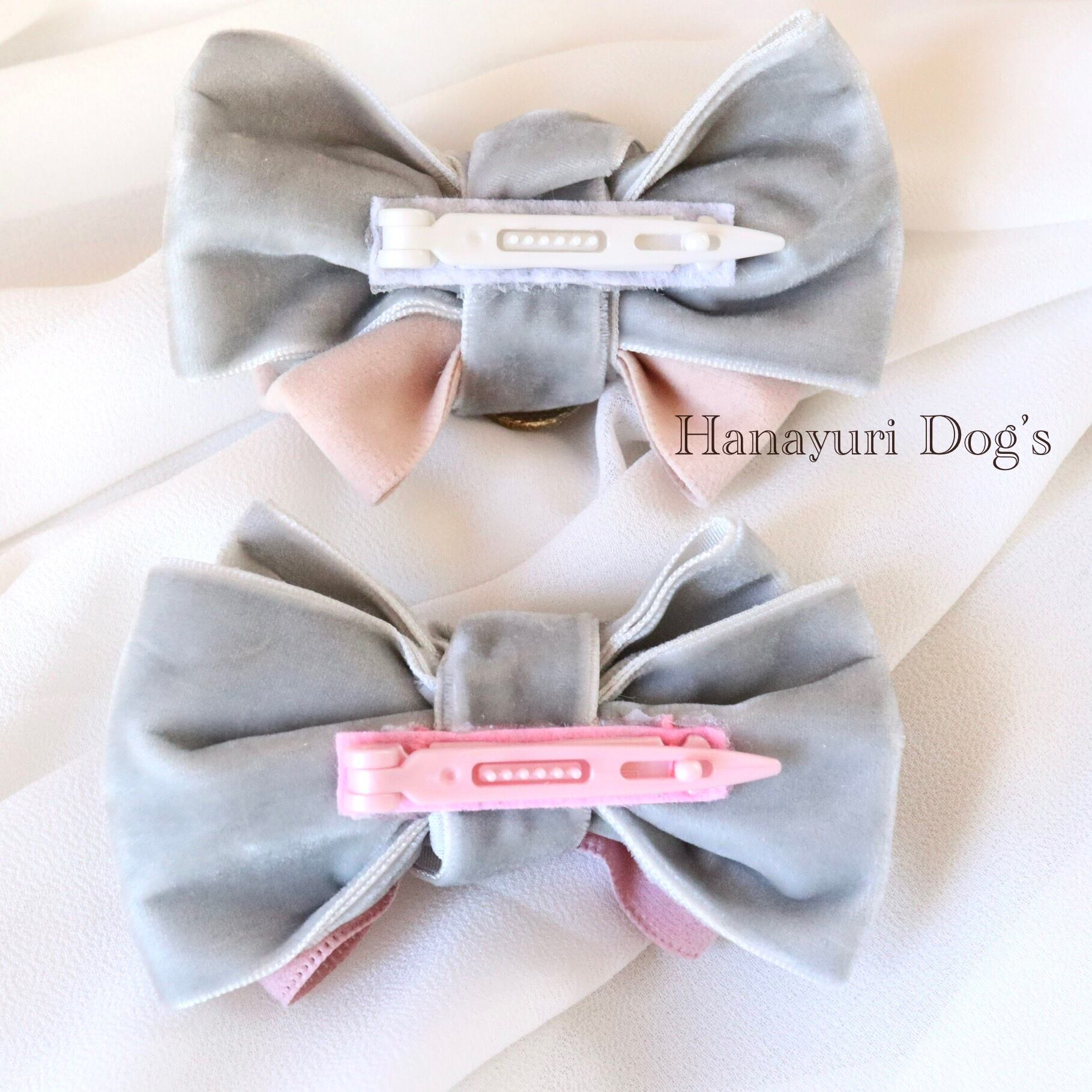 バイカラー グレー×ベージュ ベルベット アクセサリー ウェディング 結婚式 犬リボン キッズ・子供リボン 七五三 猫 ペット ヘアアクセサリー 髪飾り 普段着 うちの子記念日 誕生日 プレゼント 撮影 | Hanayuri Dog’s