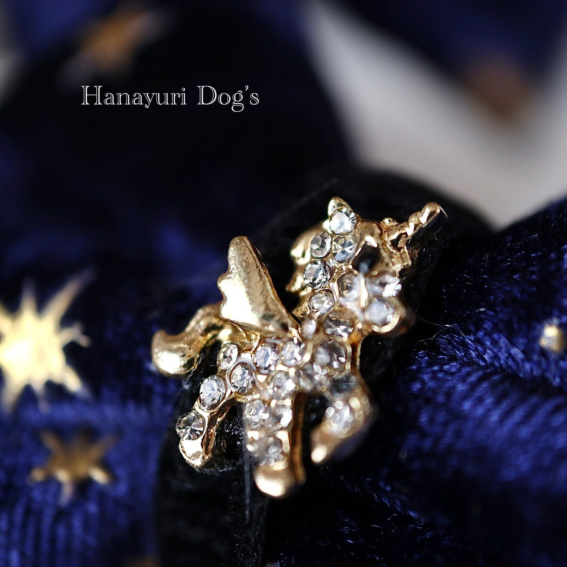 紺ベルベット ゴールド星柄 ユニコーンビジュー ゴールド ベルベット 秋冬 犬リボン キッズ・子供リボン 猫 ペット ヘアアクセサリー 髪飾り 普段着 うちの子記念日 誕生日 プレゼント 撮影 | Hanayuri Dog’s