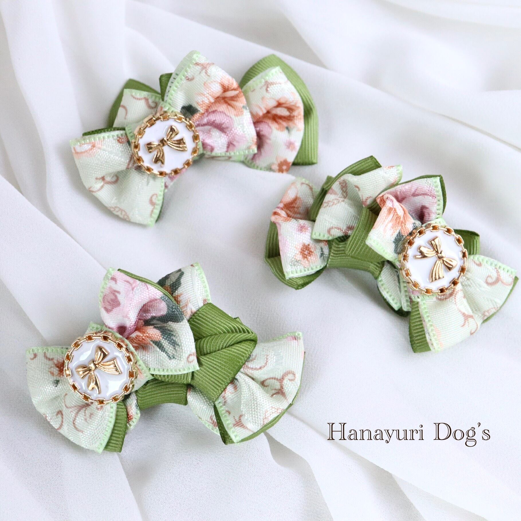 爽やかなグリーンのフローラル柄にオリーブグリーンのグログランりぼんを合わせた若々しい印象の髪飾りです。